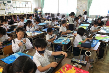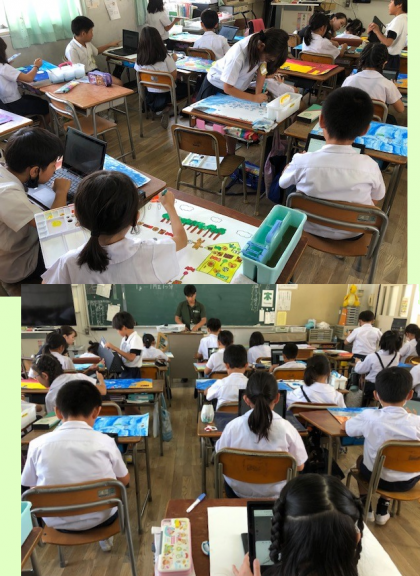 パソコンを開いているのは、できた人から作品を自分で登録しているからとのこと。すごいことを平気でやれるようになっている子どもたちです。