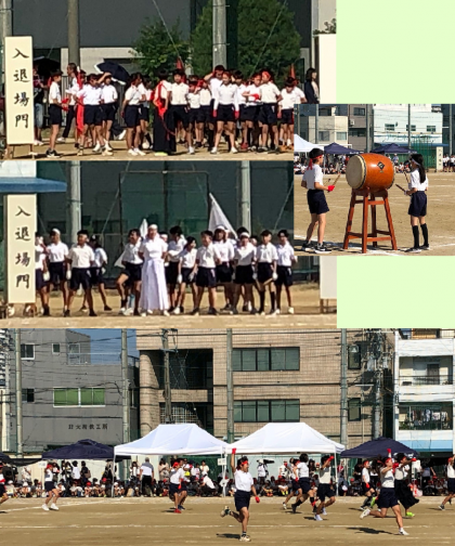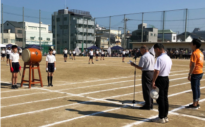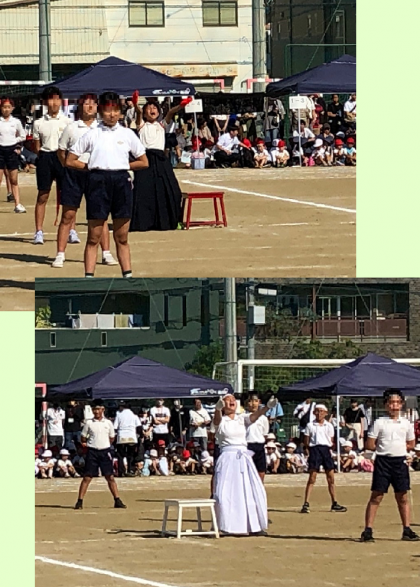 その前に、「来賓の方々や保護者の方々が一堂に会するこの機会に、みんなで島屋小学校の創立百周年をお祝いしましょう」と、創立百周年事業委員長、PTA会長、本校校長が、運動場に出て、呼びかけられました。