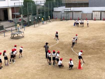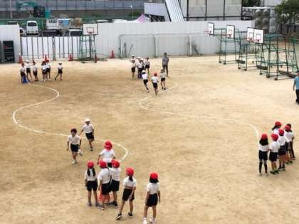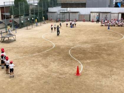 並んでいる子どもたちの様子を見ると、両端から内側に向かって波線のとおりに動き、向かい合ったらジャンケンをして、負けた方は線から離れて次の走者が端からスタート、勝った方はそのまま向かって、また二人が出会ったところでジャンケンをする、相手方の端まで行けたら勝ちというゲームのようです。
