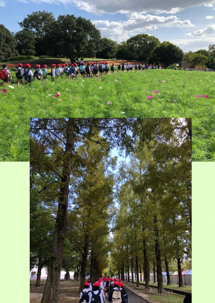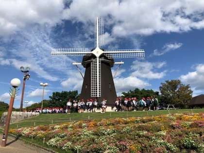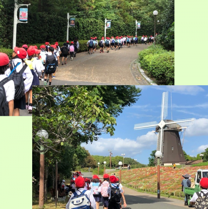 風車をバックにクラス写真を撮ったあとは、コスモス畑や並木道を通り、帰路につきました。