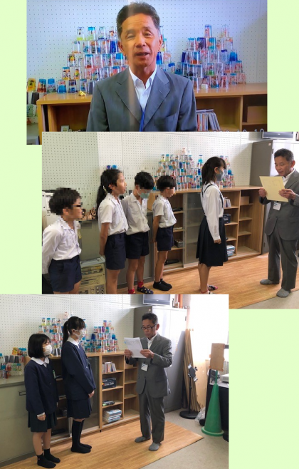 朝まで残った雨のため運動場が緩んでいるので、放送室からの朝会です。