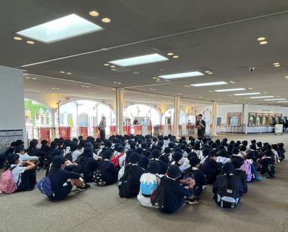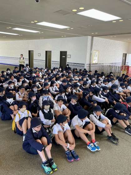 入場前に先生から諸注意を聞いています。しっかりと真剣に話を聞く姿勢は、さすが島屋の6年生です。この後のグループでの活動も楽しみです。