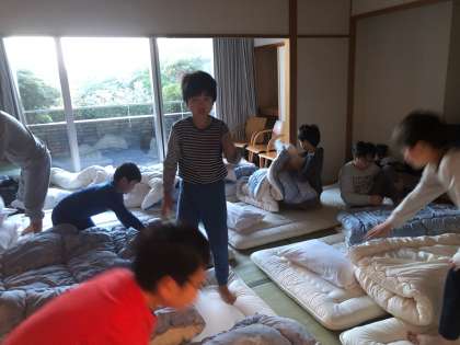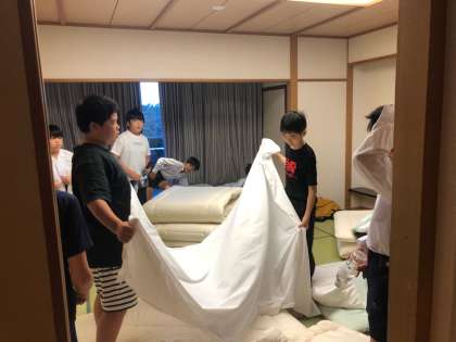 部屋の仲間と協力して、布団をあげて、片づけをしていました。