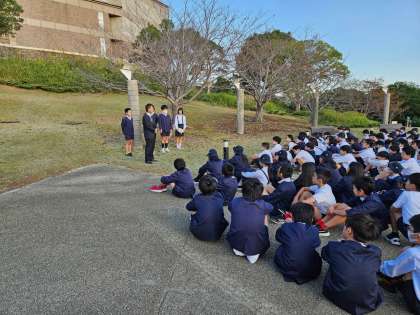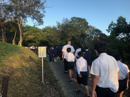 6時30分、朝の集い。いい天気です。海の見えるところまで散策します。