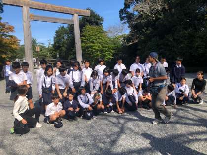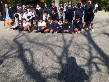 伊勢神宮の鳥居前で学級写真を撮ります。