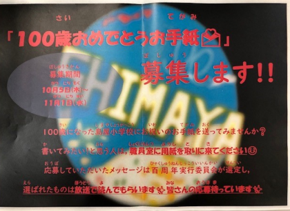 100歳になった島屋小学校にお祝いのお手紙を送ってみようと、10月5日から募集が始まりました。