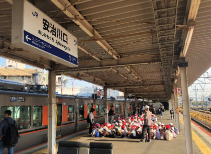 学校から緑道を通ってJR安治川口駅に到着した子どもたちは、元気に、電車に乗り込みました。