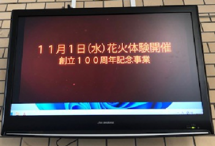 8月26日の100周年記念夏祭りの夜の部で行われるはずだった「花火体験」が、来る11月1日の島屋小学校創立記念日に行われることになり、そのお知らせのバージョンになっています。