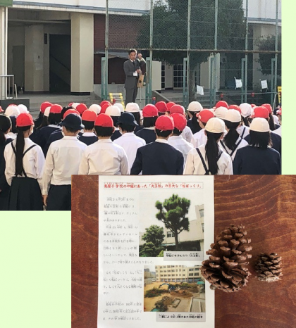 校長先生からのお話で、4年生・6年生の教室がある棟を建てるとき、今の中庭の敷地に、校舎を南側に建ててしまえばもう育たないだろうと、伐採してしまった大きな木があり、その一つである松の、大きなマツボックリがありますと披露してくださいました。一般のものと大きく違うそのマツボックリは、現在、校長室前に展示しています。