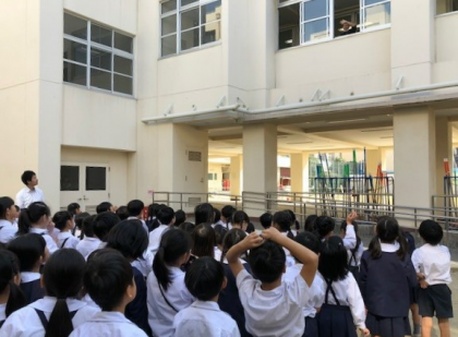 カメラマンをしてくださった6年生の先生が居る2階に向かって、「はいポーズ」。