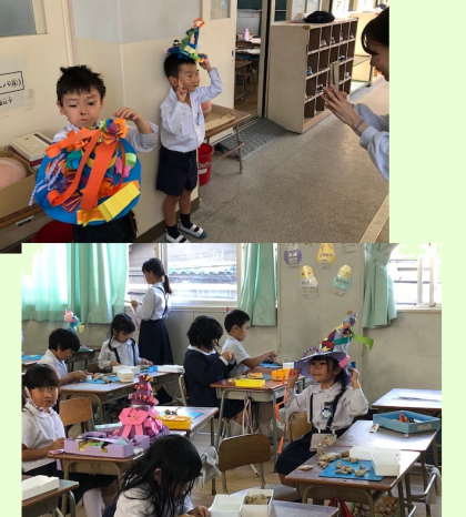 子どもたちはとても豪華な帽子を作っていて、作品展に出すために今日がんばって仕上げました。その記念写真かな。一人ずつ、貴婦人、貴公子のようないでたちになって、カメラに収まっていました。