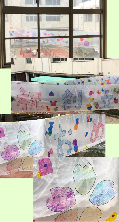 向かい合う窓に掛けられた2本のロープから下がっている横長の垂れ幕は、1年生と6年生の共同制作です。キラキラと輝くセロファンを貼ったのが1年生、お祝いの言葉を書いたのが6年生です。近寄ると、その繊細さがわかります。セロファンはただ細かいものを付けたのでなく、キャンディや果物やハート型などかわいい形が散りばめられています。文字は色を塗ったのではなく、細かく線描で模様付けられています。とても細かい作業を丁寧に根気よく続け仕上げたのがわかります。