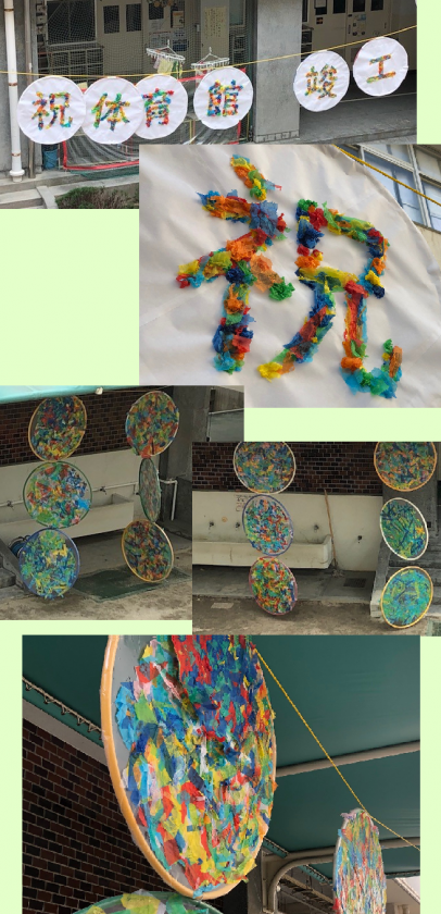 丸いいくつかの円盤に、模様と文字がある作品は2年生と4年生が作りました。円盤に見えるのはフラフープに紙を貼り付けたものです。2年生は色とりどりのお花紙を千切ってその円に盛り、貼り付けました。4年生は、千切ったお花紙でカラフルな文字を作りました。
