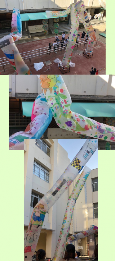 風によって面白い動きを見せている作品は、3年生と5年生の共同作品です。薄いビニールの筒状の生地に、みんなで絵を描きました。立ったり横になったり伸びたり縮んだり、しっかり絵が見えるのも一瞬で、それが妙味にもなっています。