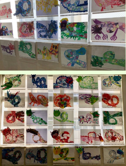 来年の干支である辰を描きました。辰の特徴は、ぐるっととぐろを巻く胴体、そしてうろこをはっきり表現することです。ねじれた胴体を画用紙いっぱいに描くと、うろこは、一枚一枚少しずつ色を足して塗ったり、にじみを使ったり。