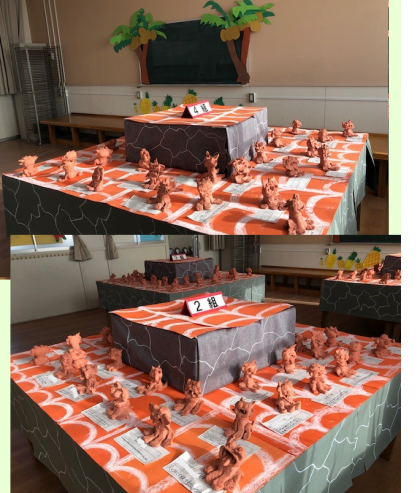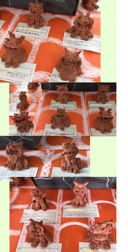 自分のイメージするシーサーを、思い思いに表現しました。会場設営は先生たちが行いましたが、赤い瓦や石垣をイメージした陳列台も、シーサーの引き立て役として、一役買っています。