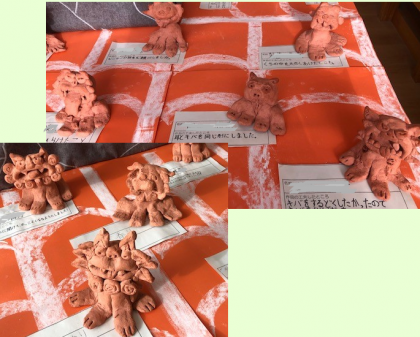 5年生は、赤茶色のテラコッタ粘土で、沖縄の守り神、シーサーを作りました。