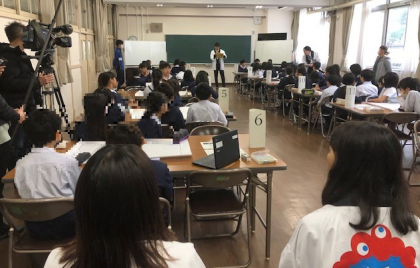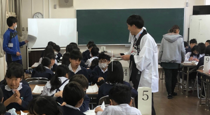 5年生が多目的室に集まり、「空飛ぶクルマ」の出前授業を受けました。3・4時間目に3・4組、5・6時間目に1・2組です。