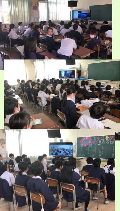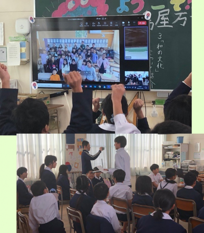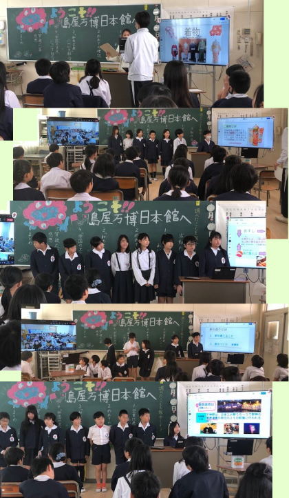 日本からの発信は、題して「ようこそ!!島屋万博日本館へ」。これまで調べた日本の衣食住、着物・寿司・住まいについて、グルーブごとに順に、画面の向こうの中国へ発信しました。
