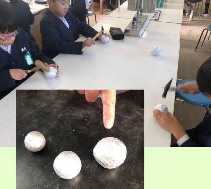 頑張って小さくしても、いびつな形になって、きれいな球にするのは至難の業とのこと。25cm幅で3.5mのアルミ箔を、写真向かって一番左の大きさの球にするべく、黙々と挑戦する子どもたちでした。
