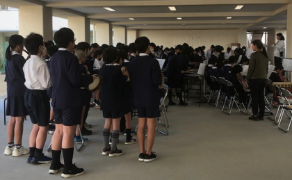6年生が合奏の練習です。12月16日の創立100周年記念式典の中で演奏するので、初めての学年全体の音合わせをしました。