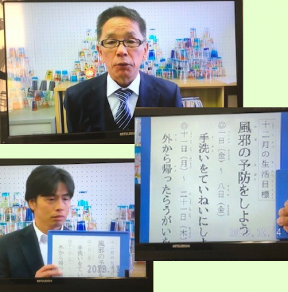 月曜の朝会です。12月に入り、寒くなってきたので、放送室からの中継です。