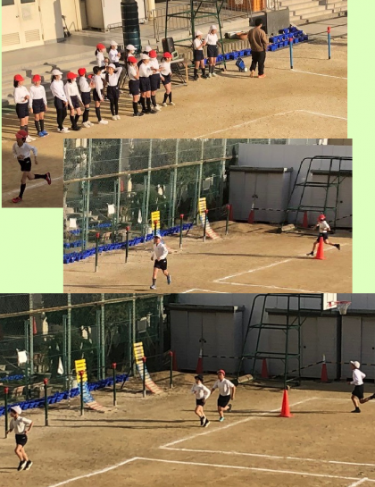 5年2組の体育の時間。男子が先に運動場を走り、女子が応援です。