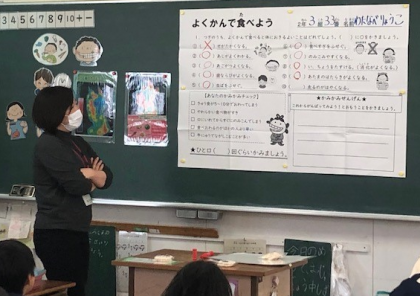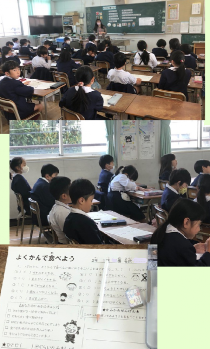 よくかんで食べると身体におきる良いことはどれ?と、プリントの質問事項にこたえていく子どもたち。先生と答え合わせをしながら、学習です。