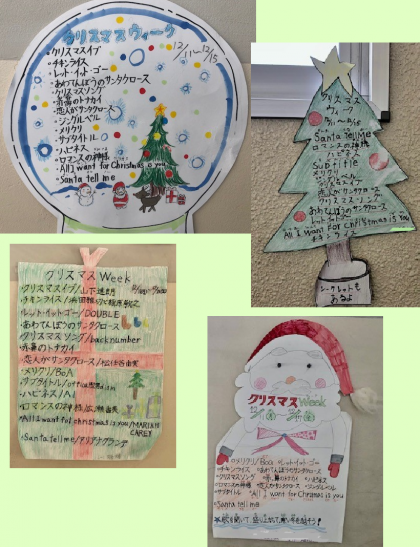 クリスマスウィークと放送委員会が銘打って、給食の時間にクリスマスの曲をたくさん流しています。