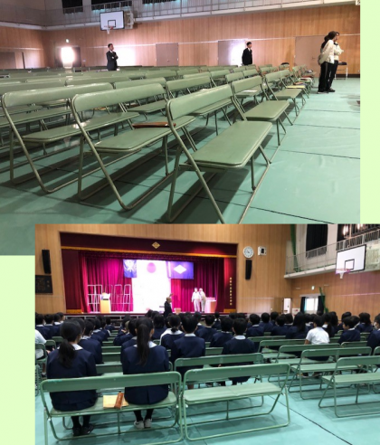 昨日に、講堂の諸々の物品の搬入があり、今日は5年生が長椅子の設営をしてくれました。