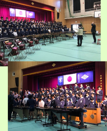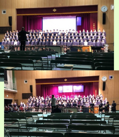 真新しい講堂で、6年生が式典で行うよびかけや合唱、合奏の練習を行いました。