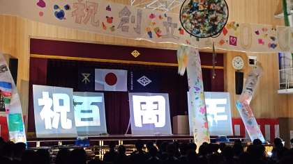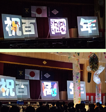 舞台上に並べられた4枚のパネルに「祝」「百」「周」「年」の文字が映し出され、その文字枠の中を、音楽に合わせ様々な動画が動きます。