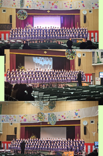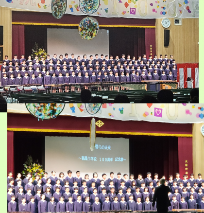 二曲目は、昨年度の6年生が作詞してできた、100周年記念歌「ぼくらの未来」を歌いました。スクリーンには昨年度の6年生が歌う様子が映され、バトンを受け継いだ今の6年生と合唱です。