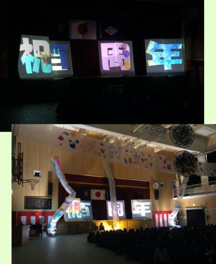 初めて入る真新しい講堂です。それだけでもウキウキなのに、会場には、百周年記念式典の飾りつけと同じものが飾られています。入るなり歓声があがりました。