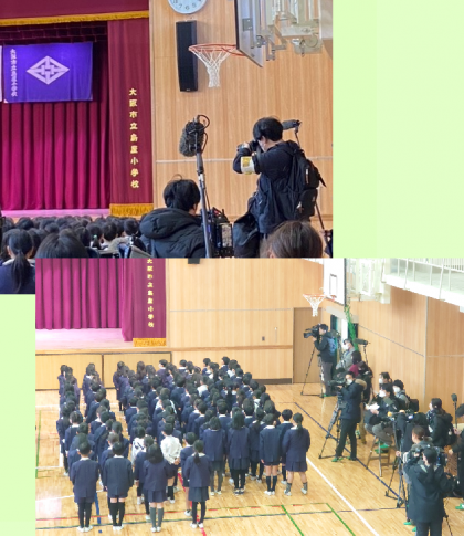 朝の登校のときからたくさんのカメラを向けられ、新聞社やテレビ局の関係の方が先に入っている講堂に入る子どもたちは、ちょっぴり緊張気味です。