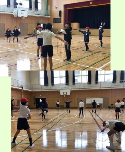 朝一番の時間割が体育の6年1組。床がピカピカに光る体育館でなわとびの学習です。