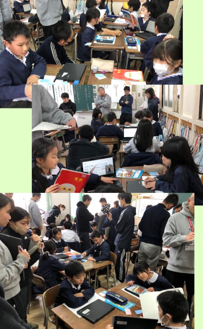 5時間目の3年3組です。国語科で学習した「人をつつむ形—世界の家めぐり」の単元を学習して、先の時間に、子どもたちは「世界の家ガイドツアー」と銘打って、世界の衣食住について調べたものを、めいめいがパソコンを使ってスライドを作りました。