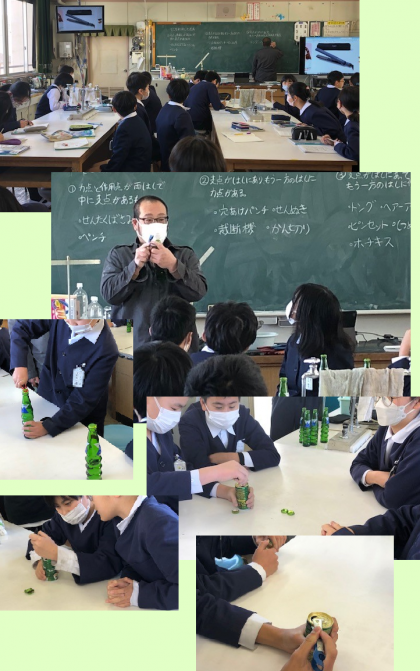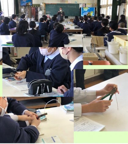 3時間目の理科室です。6年2組が、てこを利用した道具で実験です。