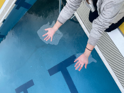 昨日今日の冷え込みで、プールの水はどうなっているのか、体育館の上にあがって見てみると…。