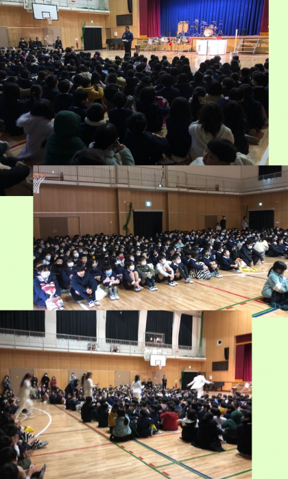 スチールパンとはドラム缶からできた楽器です。「パン・ノート・マジック」というチーム7名の奏者が奏でる素晴らしい音楽を、今日の午前、全校児童が楽しみました。