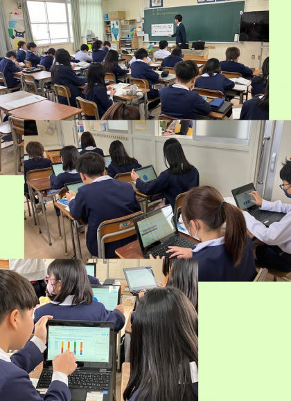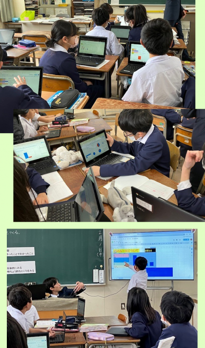 これまで子どもたちは、表やグラフを作ることを学んできました。早速パソコンを出して、提示された資料を基に、Googleのスプレッドシートを使ってグラフの作成です。