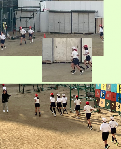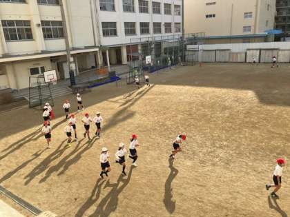 1時間目の運動場。内周をかけ足で頑張る子どもたちの姿があります。5年4組です。