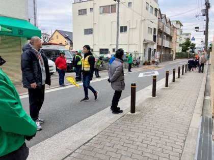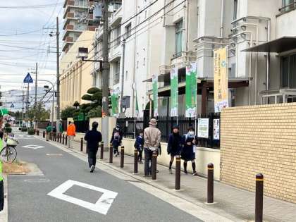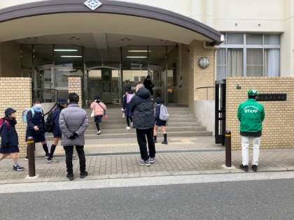 学校のフェンスにのぼりを立てられ、たくさんの方が登校する子どもたちに声がけされます。