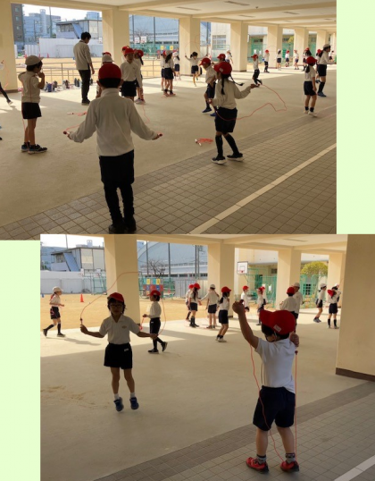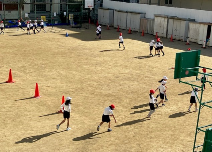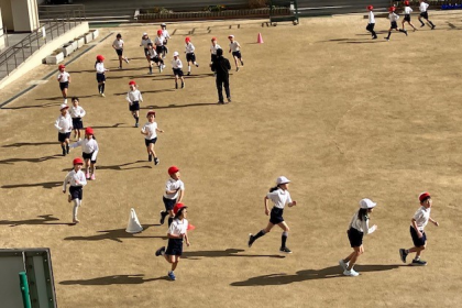 2時間目。1年2・3組の体育の時間。みんな運動場をしばらくかけ足です。寒い日は、まずは走って体を温めます。決められた時間が来るまで、しっかり走りました。