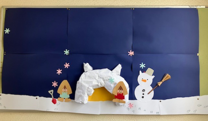 雪の中の「かまくら」のそばに雪だるまと子どもが二人。「かまくら」には雪の角が2本立っています。2月だからという理由。節分の鬼にちなんでだそうです。