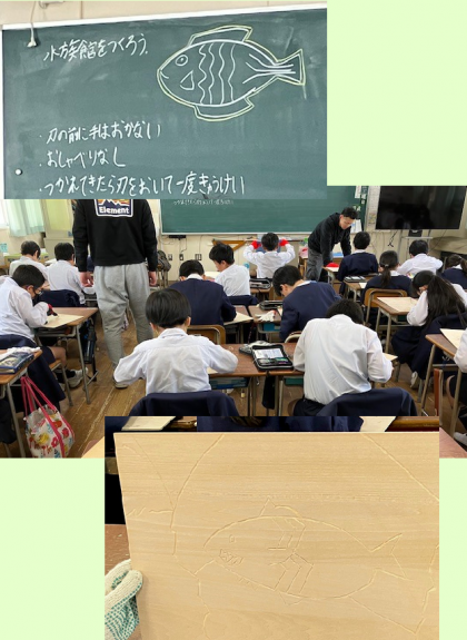 木版画に下絵を描いたあと、彫刻刀を持って掘り進めているところです。