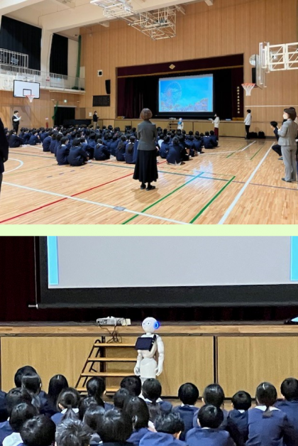 子どもたちは、「空飛ぶクルマ」をどのように活用するのか、自分たちがグループで考えたことを、数年前から学校にいる「ペッパー」にプログラミングし、発表を行いました。