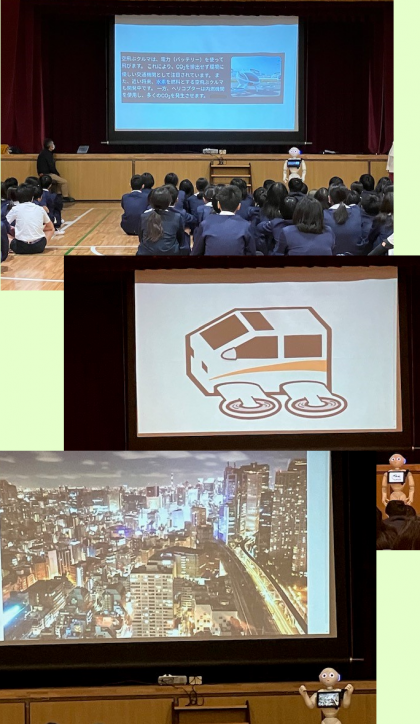 4時間目。6年生が講堂に集まり、出前授業を受けました。「空飛ぶクルマ」の最後のまとめの授業です。