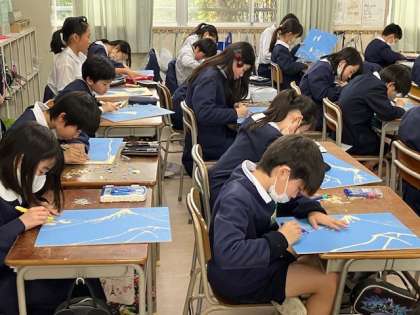 5時間目終わりのチャイムが鳴ったばかりの様子ですが、みんな微動だにせず、板に向き合っています。製作を進めるうち乗ってきたからかな。