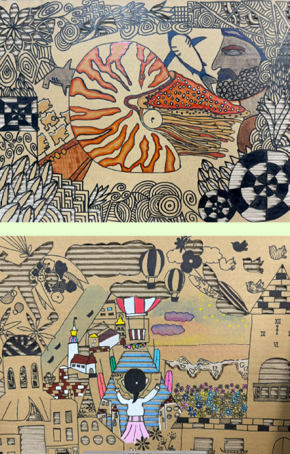 最初、作品展のときに制作した段ボールの額縁の作品が、優秀な作品だと表彰された二人の6年生が紹介されました。写真はその作品です。